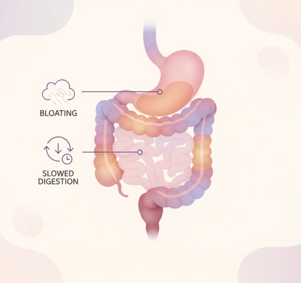 - Slower digestion: Food can take longer to move through the gut, leading to constipation, bloating, or fullness after meals.